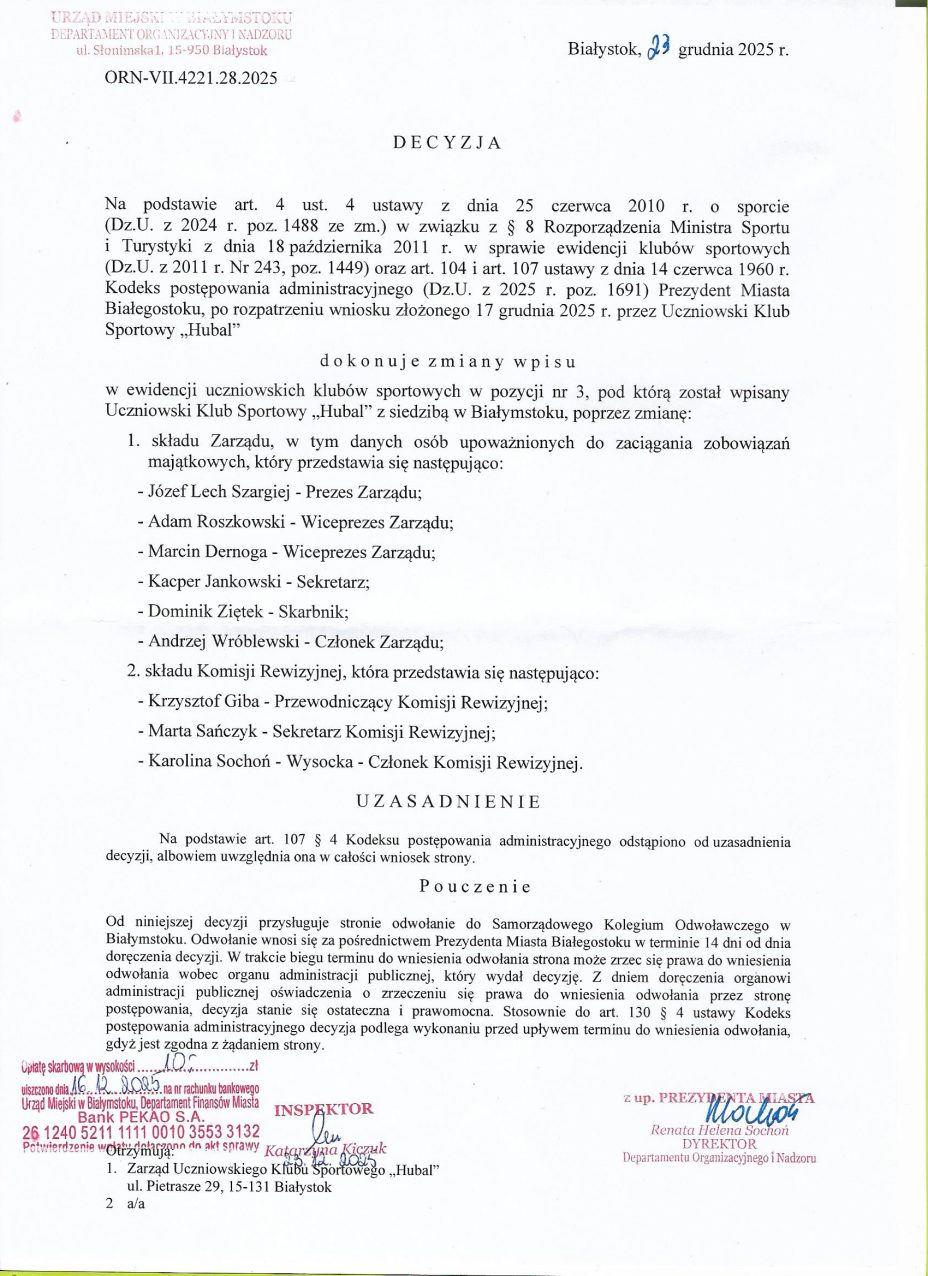 Prezydent Miasta Białegostoku dokonał zmian wpisu do ewidencji Uczniowskiego Klubu Sportowego „Hubal” Białystok – decyzja w załączeniu.